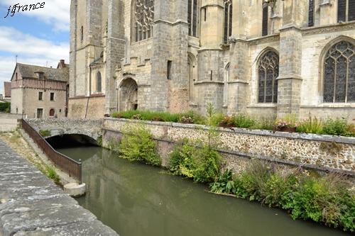 L'église Saint-Sulpice, dont la nef est inachevée. Un bras de l'Eure longe l'édifice classé, également, aux Monuments Historiques.